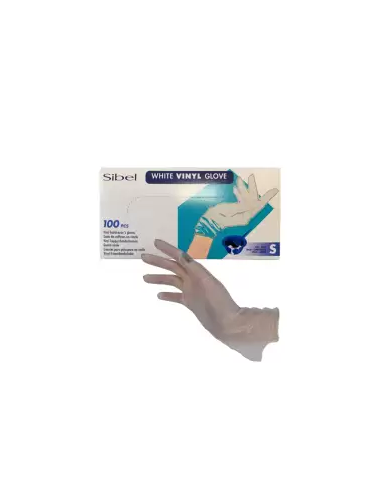 Caja de 100 guantes de vinilo sin polvo, talla pequeña, diseñados para uso profesional en centros estéticos, clínicas médico-estéticas, peluquerías y entornos sanitarios.
