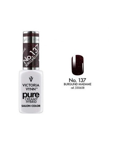 Burgund Madame es un tono saturado de vino tinto que brilla con delicadas partículas rojas, ideal para looks elegantes y llenos de sofisticación. Este esmalte forma parte de la innovadora línea Pure Creamy Hybrid, que combina lo mejor de los esmaltes cremosos y de gel en una fórmula única.