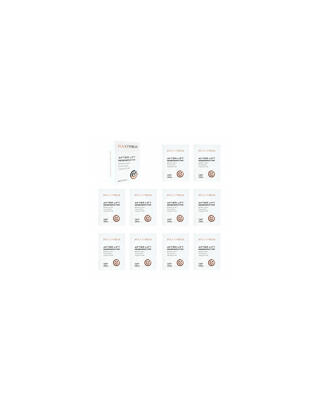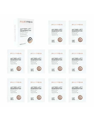 El Set de 10 unidades de After Lift Regenerator Maxymova es un sérum profesional diseñado para fortalecer, reparar y nutrir las pestañas tras tratamientos de laminación o lifting. Su fórmula avanzada incluye biosilicatos de bambú, que ayudan a sellar y proteger la fibra capilar, y ceramidas que mantienen la hidratación y ofrecen protección frente a agresiones externas. Además, contiene queratinas vegetales hidrolizadas que compactan las fibras y fortalecen desde el interior, y una red molecular de biopolímeros naturales que libera factores hidratantes de forma prolongada. El pantenol actúa como hidratante y regenerador, mientras que la niacinamida aumenta la síntesis de proteínas y niveles de queratina, reforzando y reestructurando las pestañas.