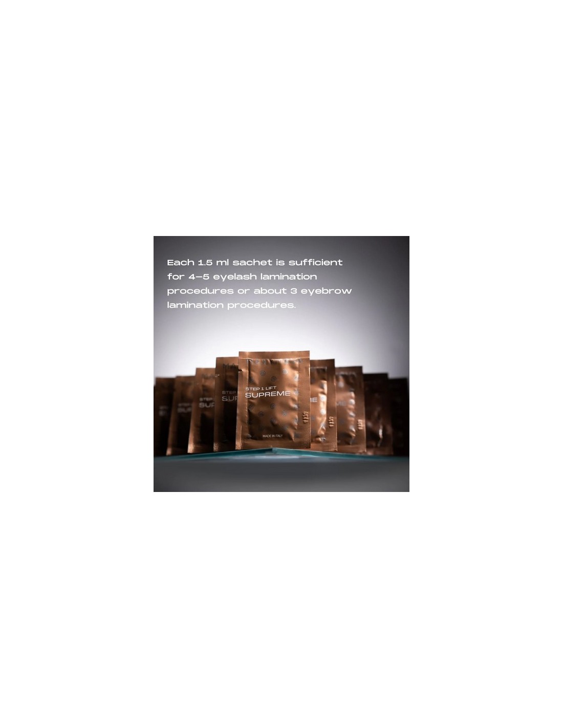 Paso 1 del sistema SUPREME. Crema lifting para laminación de pestañas y cejas. Fórmula italiana enriquecida con extracto de bambú y oliva. 5 sobres monodosis.