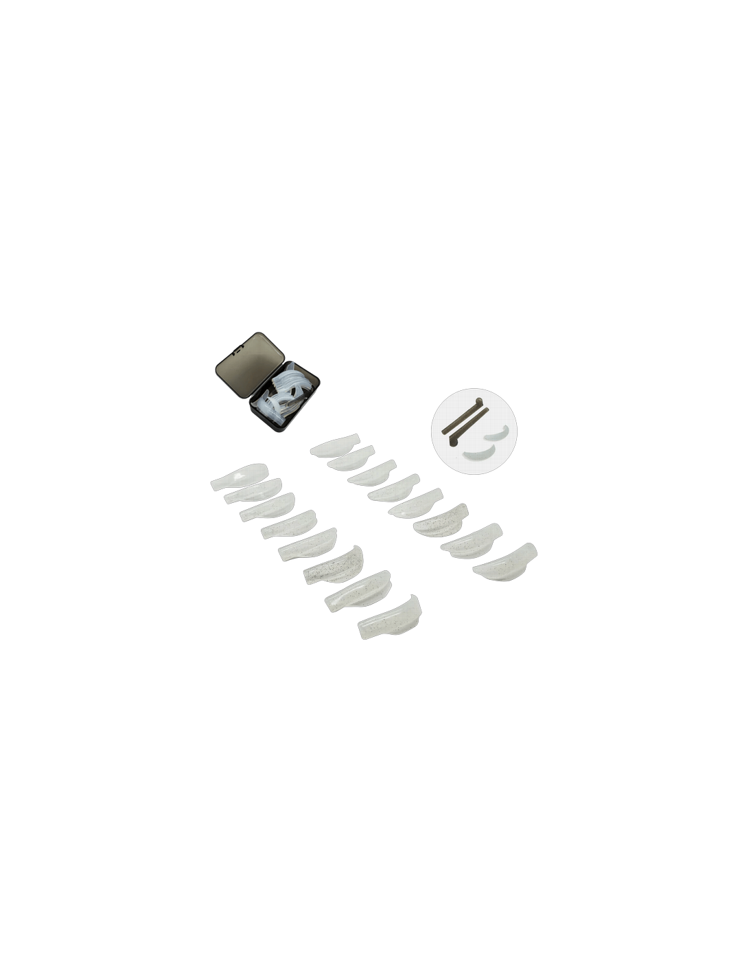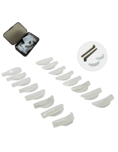 Este set incluye 8 pares que se adaptan a todas las formas de ojo y longitudes de pestaña, permitiendo personalizar el lifting para cada clienta. Además, vienen con un par especial para pestañas inferiores y un par de compensadores para perfeccionar el proceso de laminado con máxima precisión.